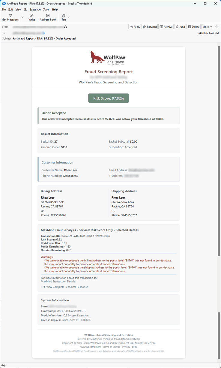 Sample Merchant Notification Email - Fraud Screening - Accepted Order