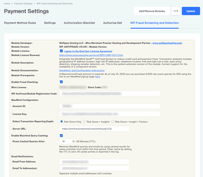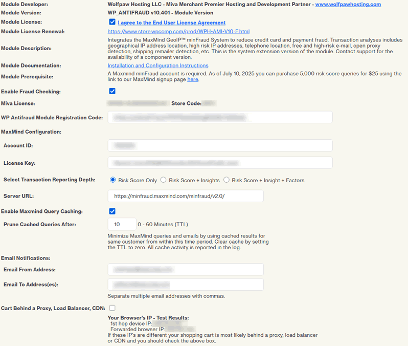 Due to changes in Miva's licensing system we recommend any previous versions of Wolfpaw's Fraud Screening and Detection module be deleted before installing this new version. Be sure to make a copy of your configuration data before deleting. Then use that data to configure the new module.